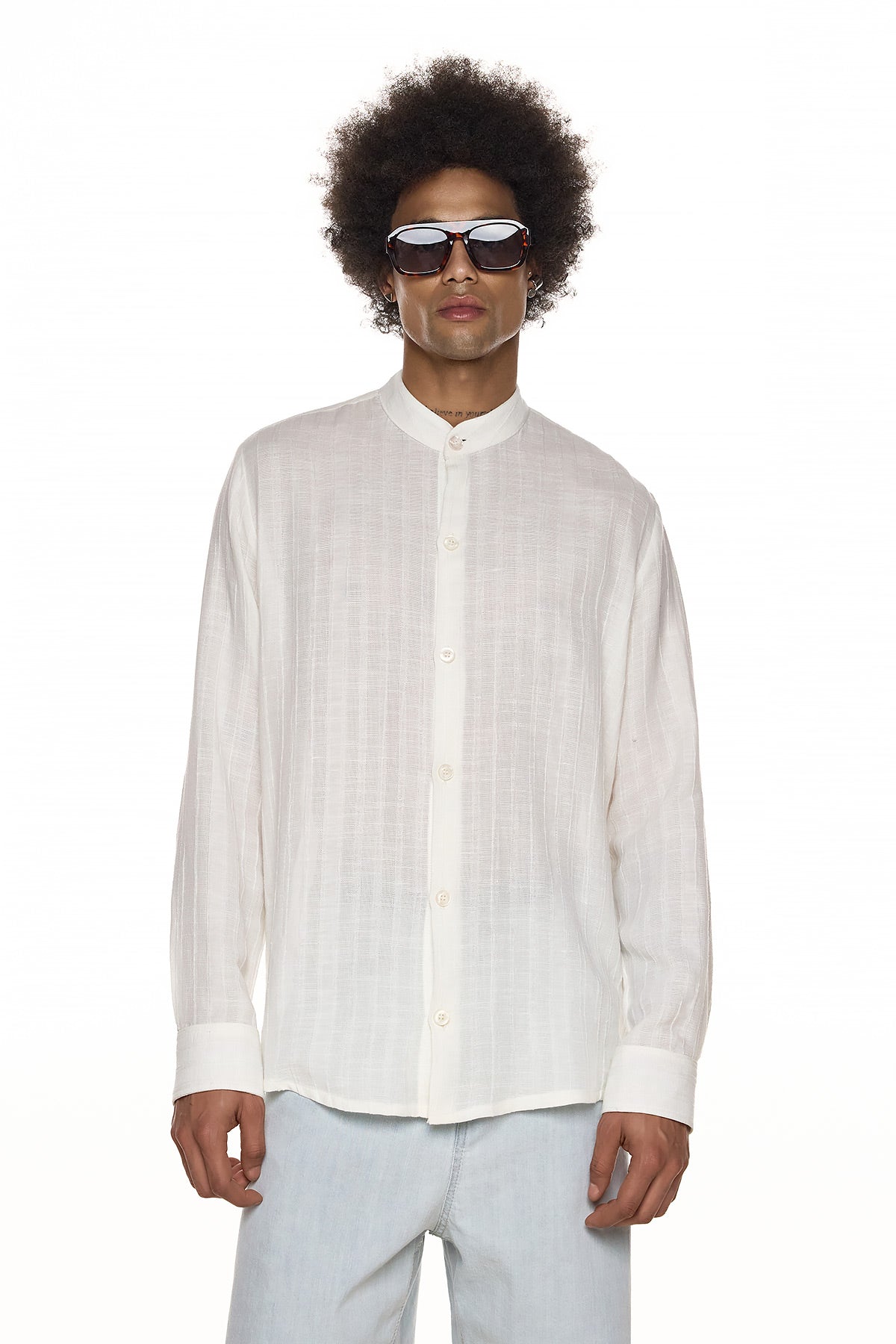 A lightweight long-sleeve shirt designed with a minimalist band collar and clean front closure. The soft structure and semi-sheer texture create a refined, contemporary look.