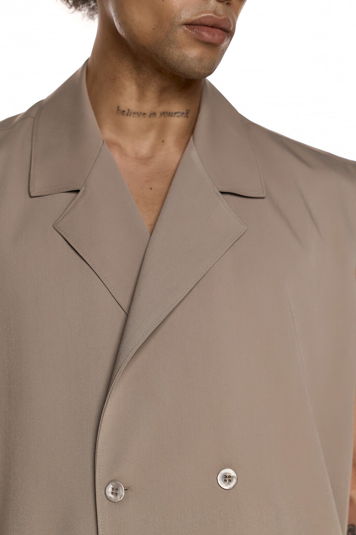 Crafted from a smooth woven fabric with a matte finish, the warm beige tone enhances the garment’s soft structural presence while preserving a refined aesthetic.